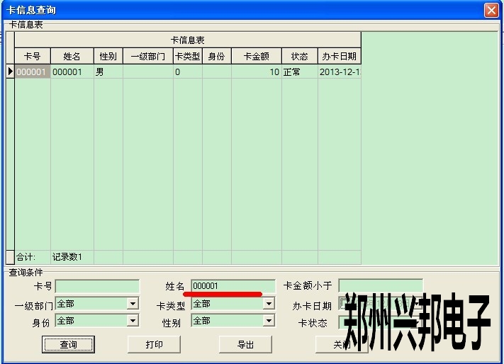 如果不知道此卡的卡號,可以從卡信息表中查看到此卡的信息,點數據管理--卡信息表,打開此表后輸入姓名,然后查詢就可以查看到此卡的卡號,然后再掛失即可,如下圖所示