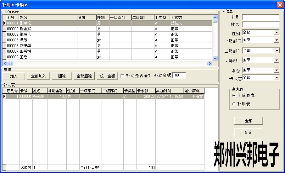 軟件中卡管理-補助入卡-補助入卡輸入中添加補助人員的名單,可以選擇是否清零,若選擇補助清零,在領(lǐng)取補助時會將卡上的金額先清零再補助上此次的金額;若選擇不清零,則在領(lǐng)取補助時會累加之前卡上的金額。