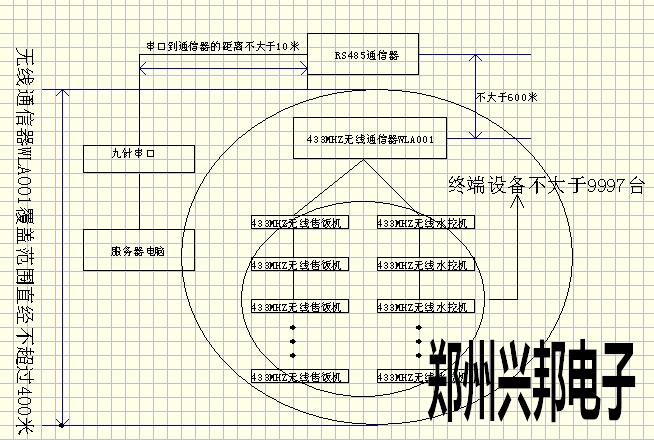 433MHZ無線通信器(WLA001)使用框圖如下所示,一個433MHZ無線通信器(WLA001)的無線覆蓋范圍為直經400米(空曠地區);只要在收發的范圍內,可連接的終端設備的臺數理論上沒有限制;地址號9998、9999,終端設備不可用,系統使用;
