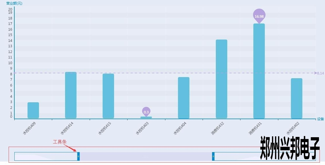 這是一個柱狀的數(shù)據(jù)圖表,展示了各個終端在所查詢時間內(nèi)的營業(yè)情況,那么最下面的那條橫杠是什么呢?其實那是一個工具條,用來集中顯示某個具體的柱狀數(shù)據(jù),如水控機409以及后面的幾個數(shù)據(jù)都看不大清楚,想要拉近一點看看,怎么做呢,很簡單,只要拉動最下面的工具條就好了,就像這樣: